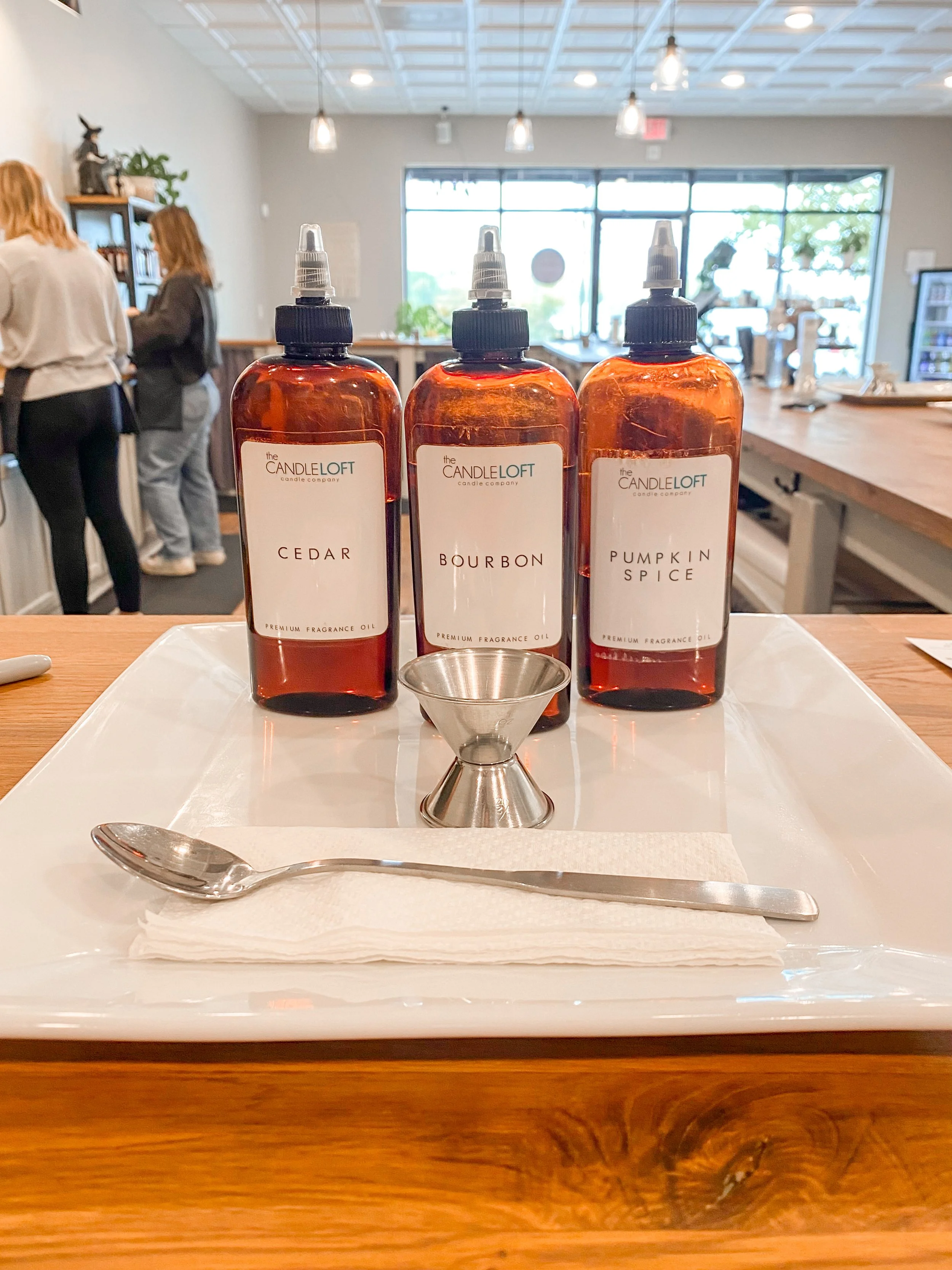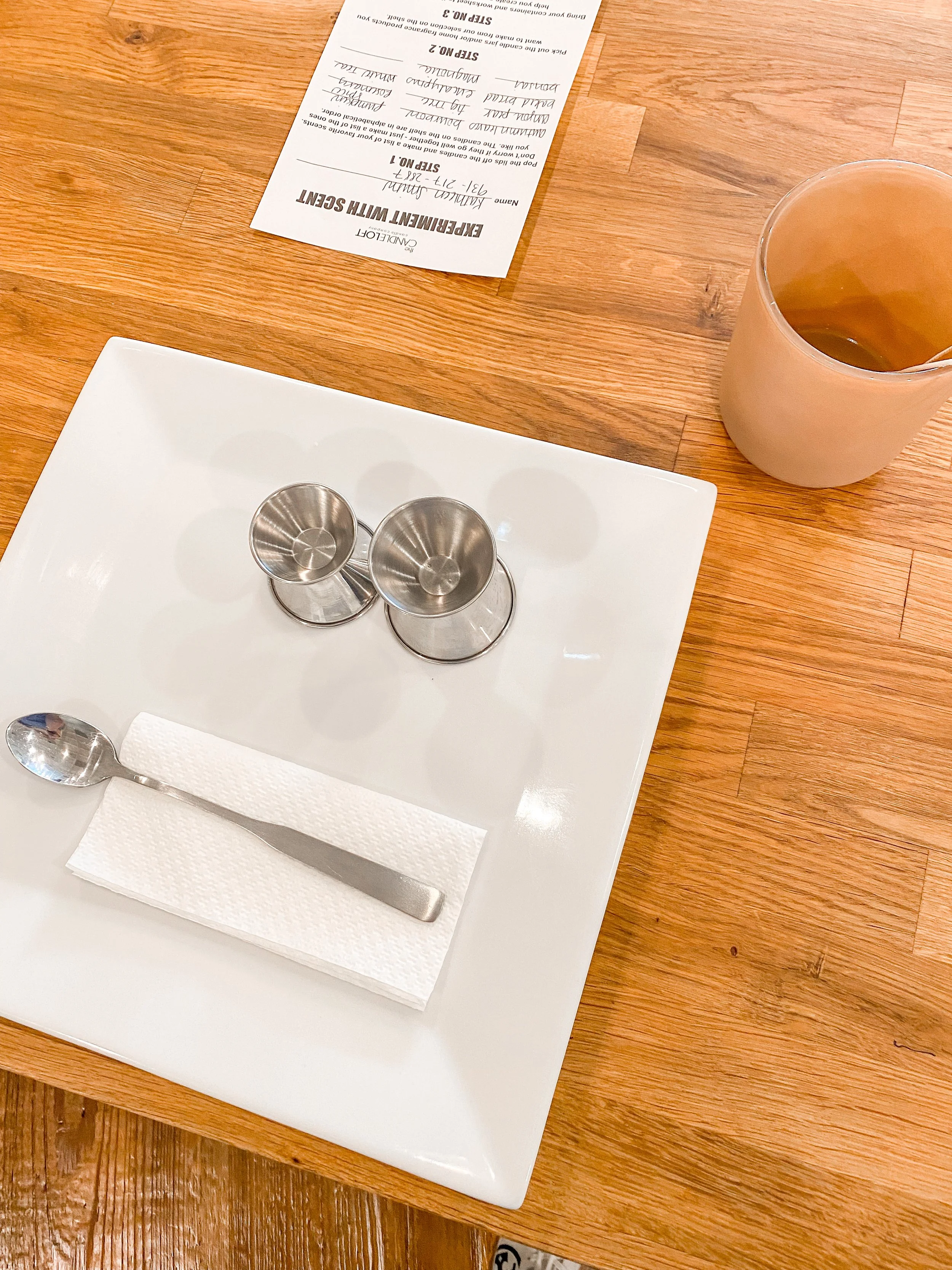 After Step No. 1 was completed, one of the staff members would welcome you to the workstation bar where more smelling and mixing would begin. We were instructed to mark the six scents that jumped out at us, only by name. Those oils were pulled and we spent our time sniffing all 6 scents to try and narrow down what would create our candle. I knew I wanted a fall scent so I picked Autumn Leaves, Baked Bread, Bourbon, Pumpkin Spice, and my two super favorites were Magnolia and White Tea.